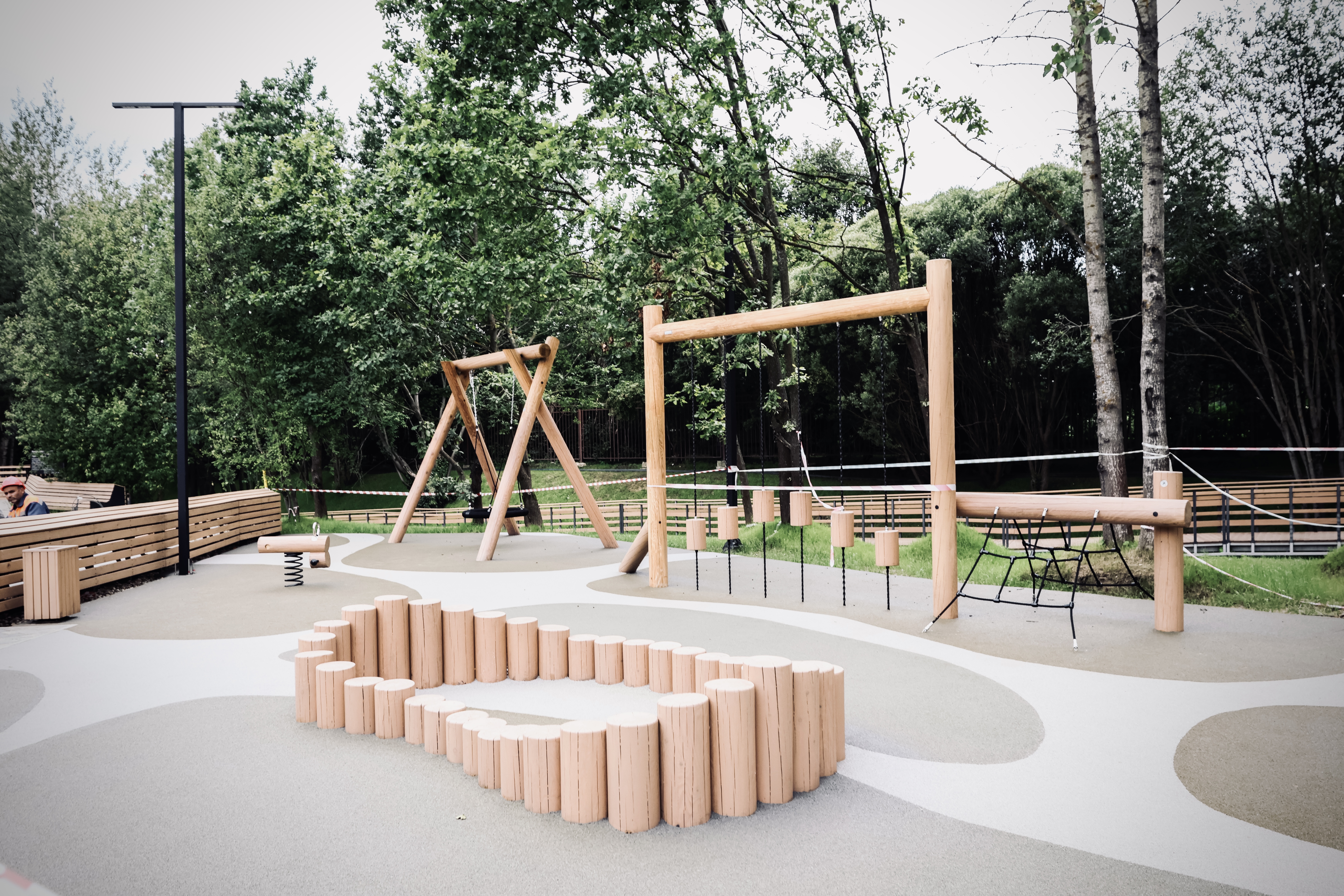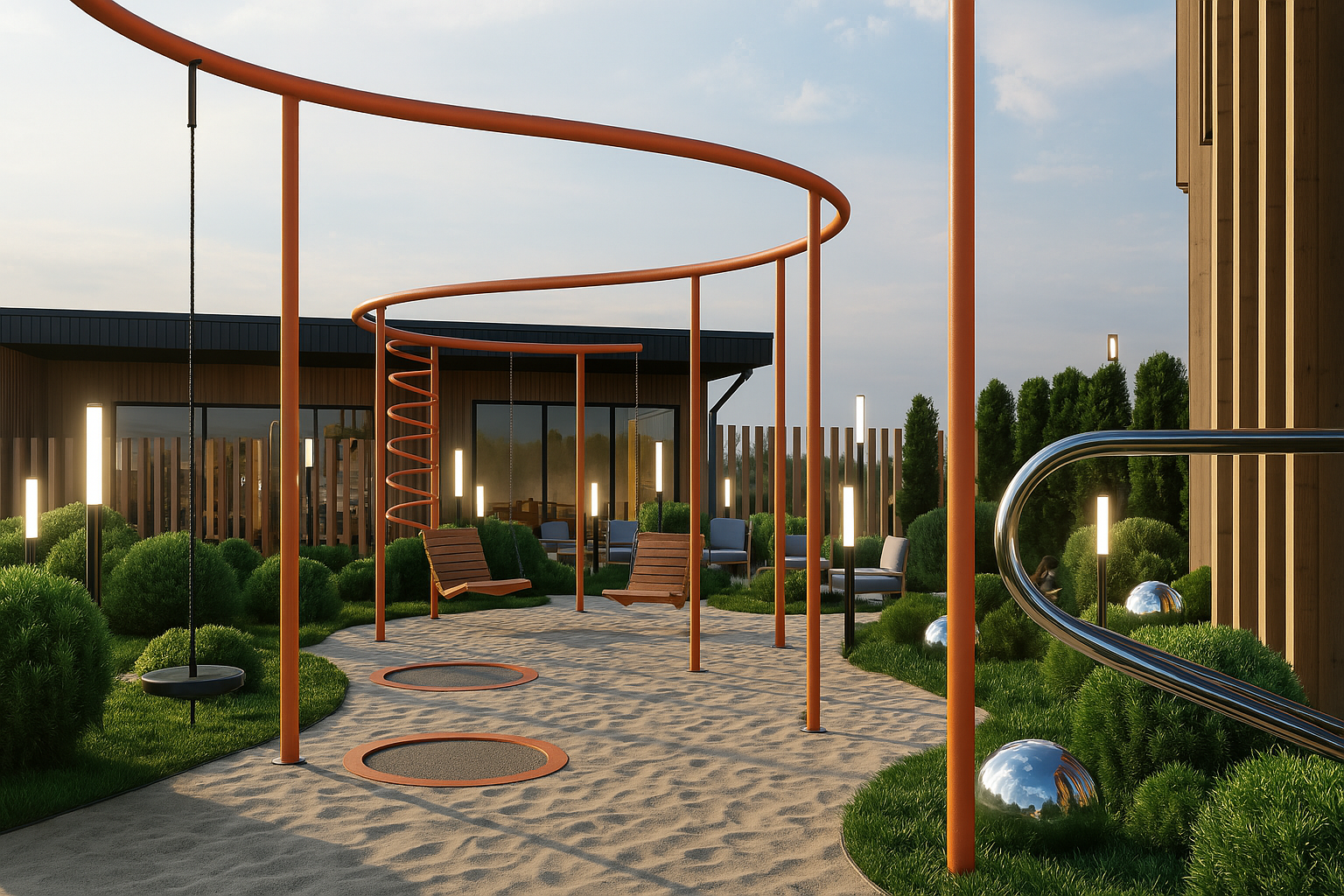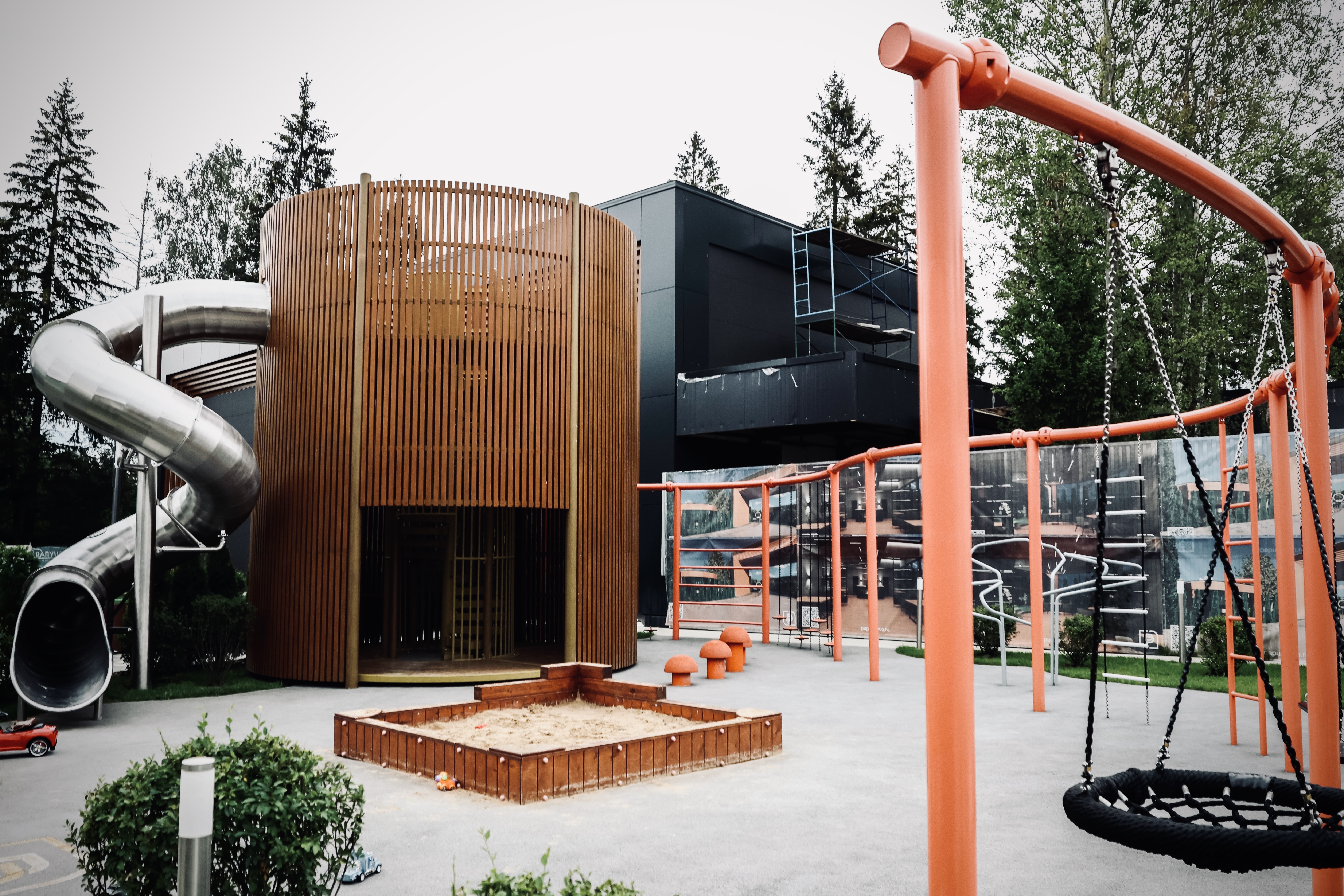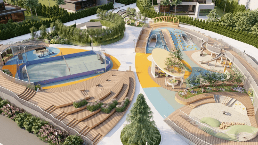 Отдельные зоны для малышей от 1 года, детей и подростков. Природные материалы, органичное включение в ландшафт и крытые обогреваемые павильоны. Многообразие активностей — от динамичных игр на горках и канатах до творчества в амфитеатре и йоги для родителей.