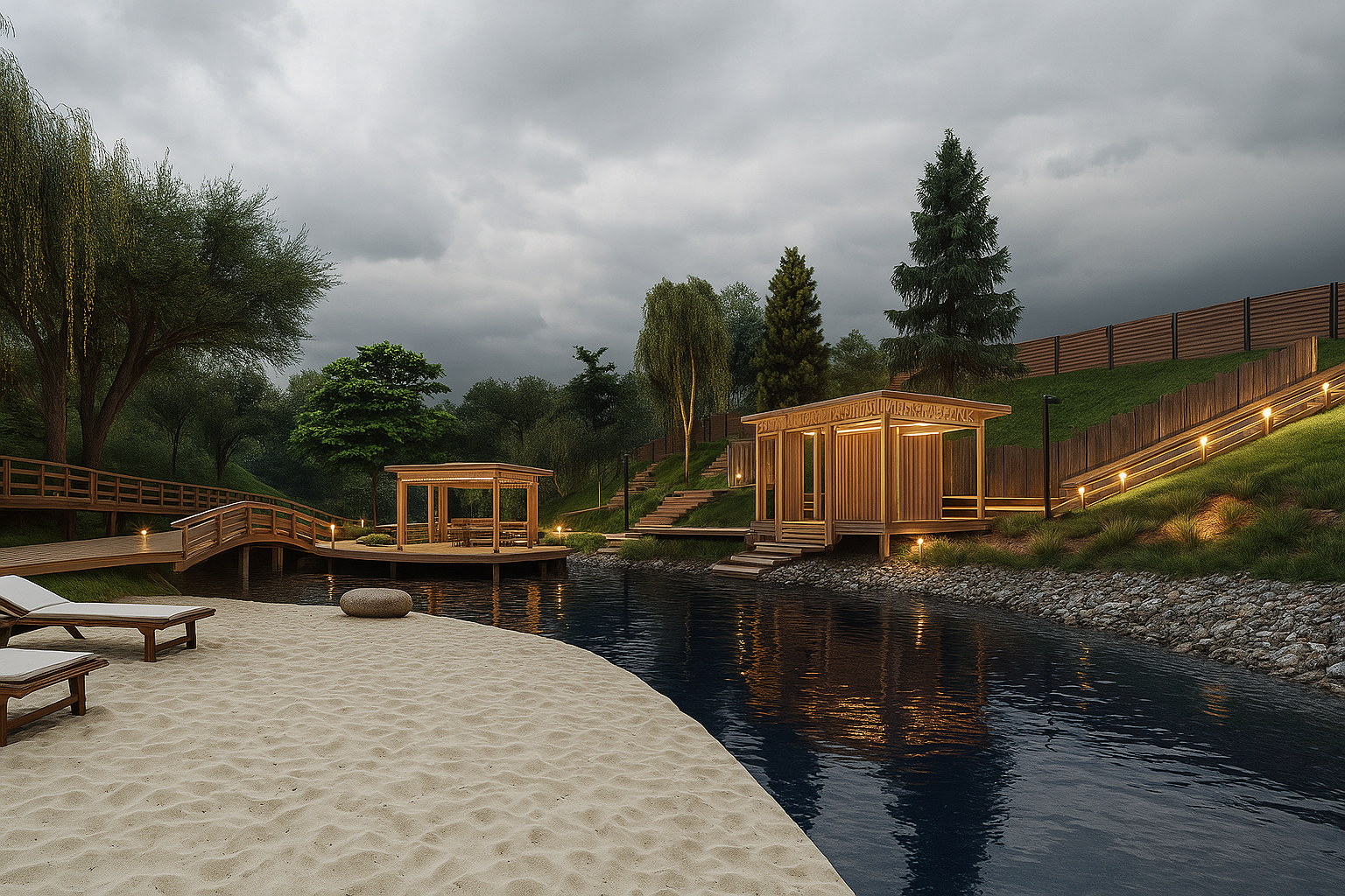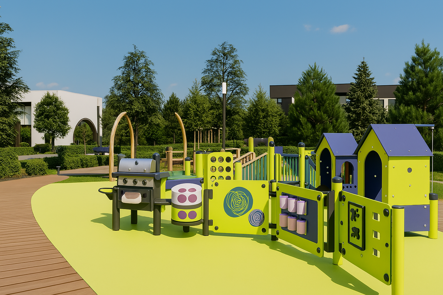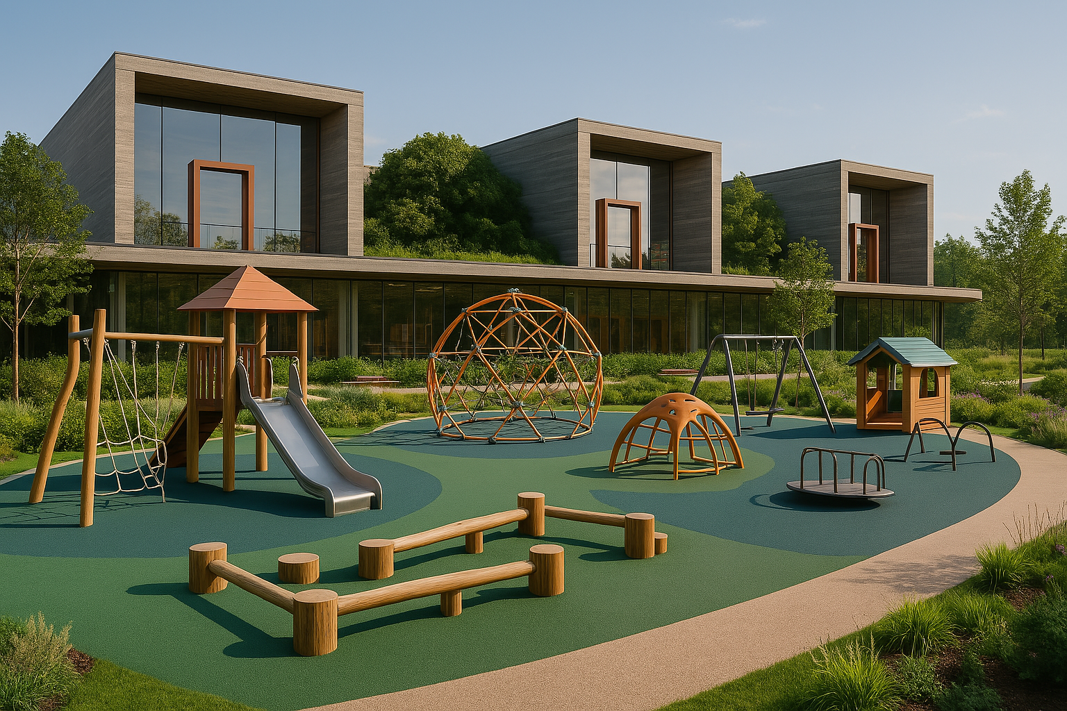 Отдельные зоны для малышей от 1 года, детей и подростков. Природные материалы, органичное включение в ландшафт и крытые обогреваемые павильоны. Многообразие активностей — от динамичных игр на горках и канатах до творчества в амфитеатре и йоги для родителей.